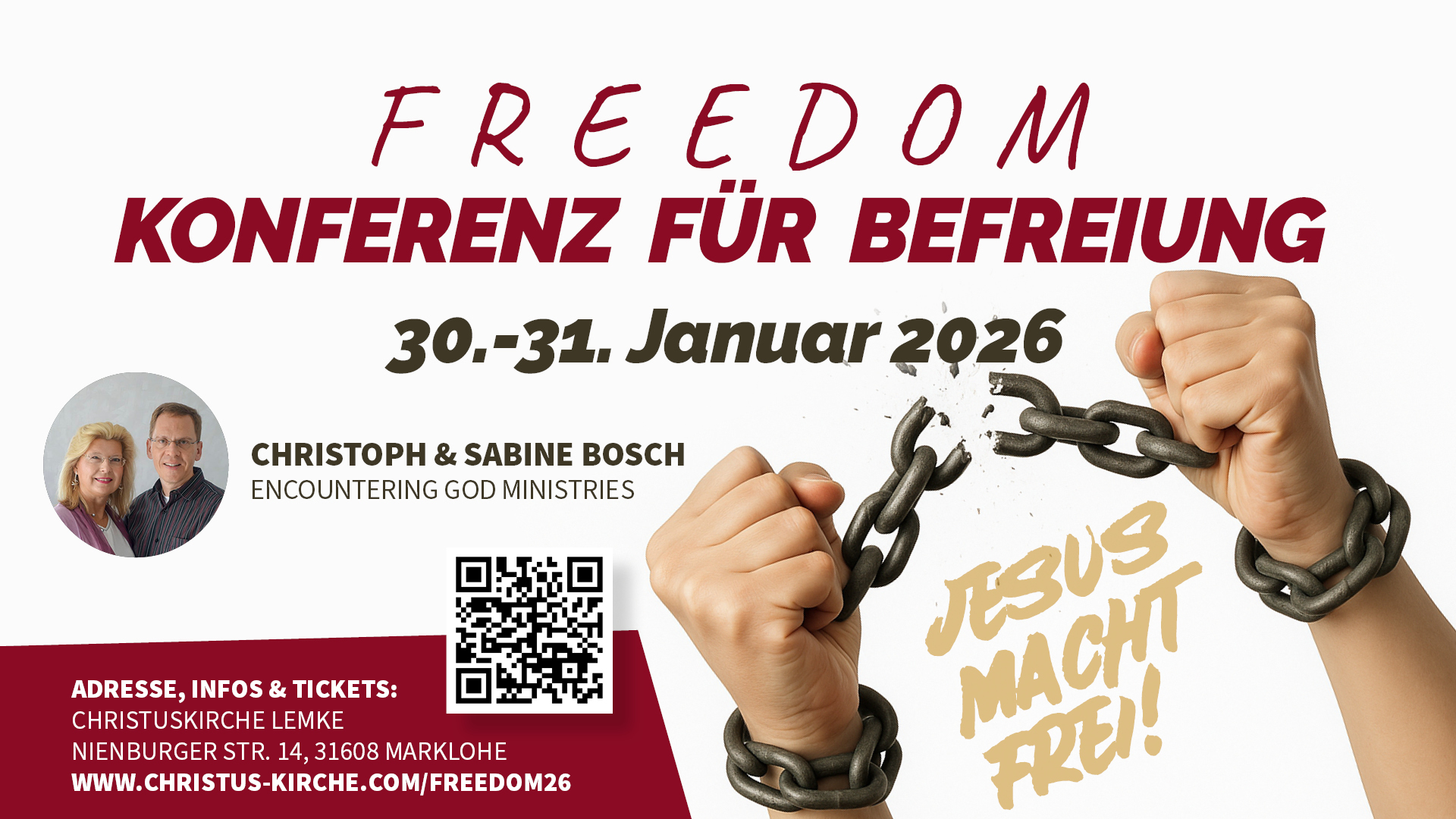 Wir sind eingeladen in der Christuskirche Marklohe-Lemke (bei Nienburg) Ende Januar ein Seminar zum Thema Befreiung zu halten: FREEDOM – Konferenz für Befreiung 2026 Jesus macht frei! Zwei-Tage-Konferenz für Befreiung! Wenn der Sohn euch frei…